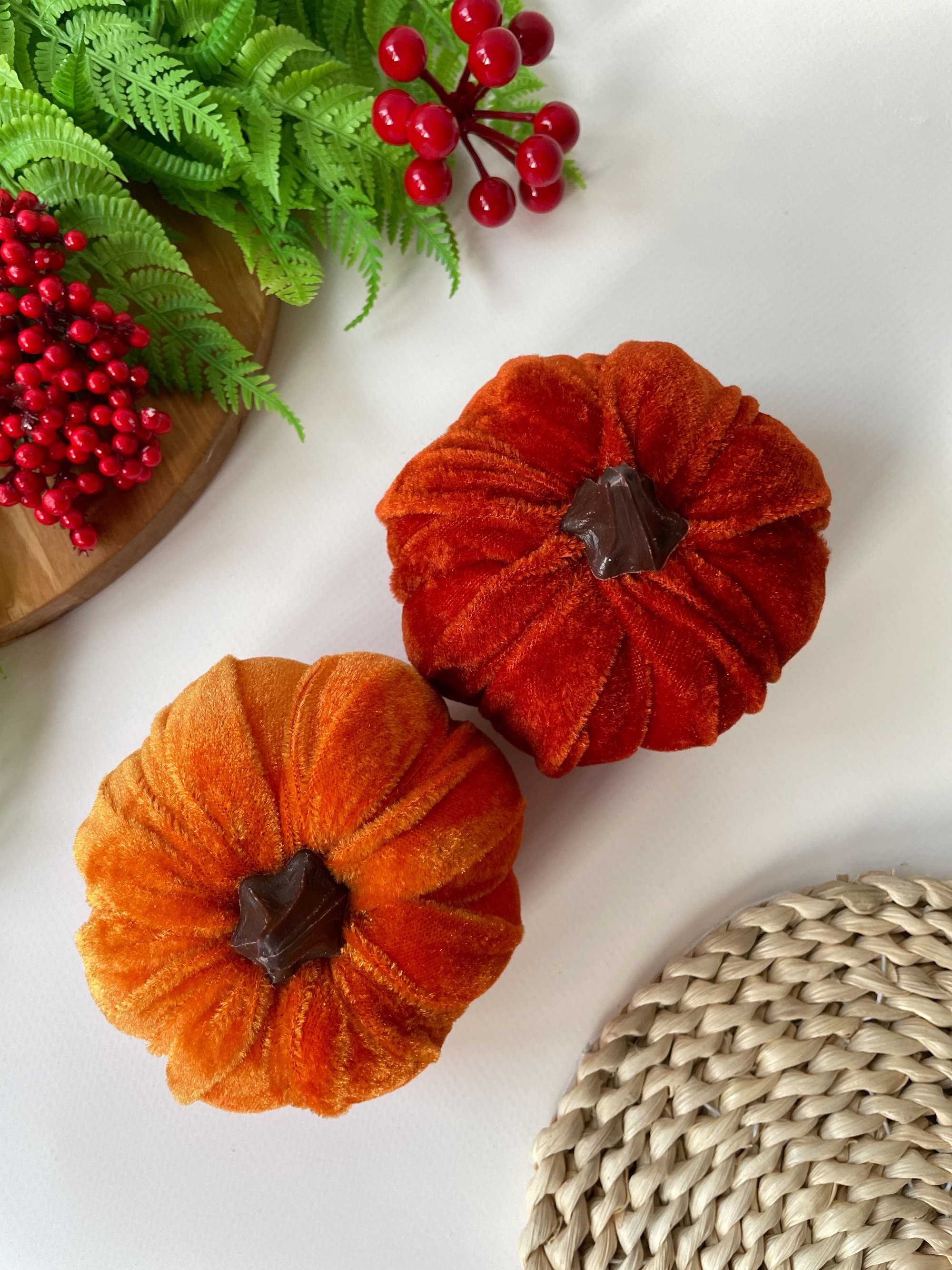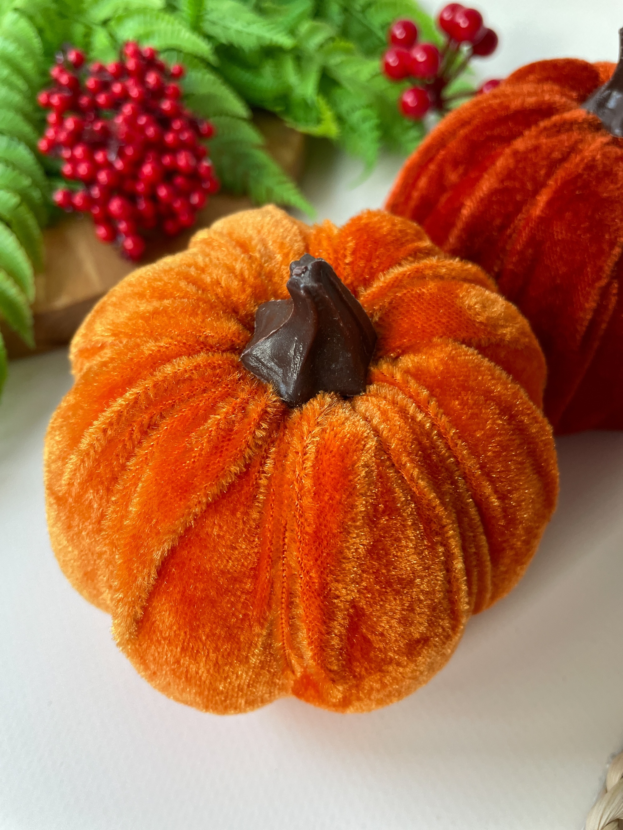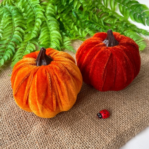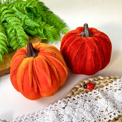 Бархатные тыквы идеально подходят для сочетания с другими осенними элементами декора, такими как осенние листья, ветки, шишки, ягоды, свечи и натуральные материалы. Их можно использовать как самостоятельный акцент или комбинировать в группах для создания более выразительного эффекта.