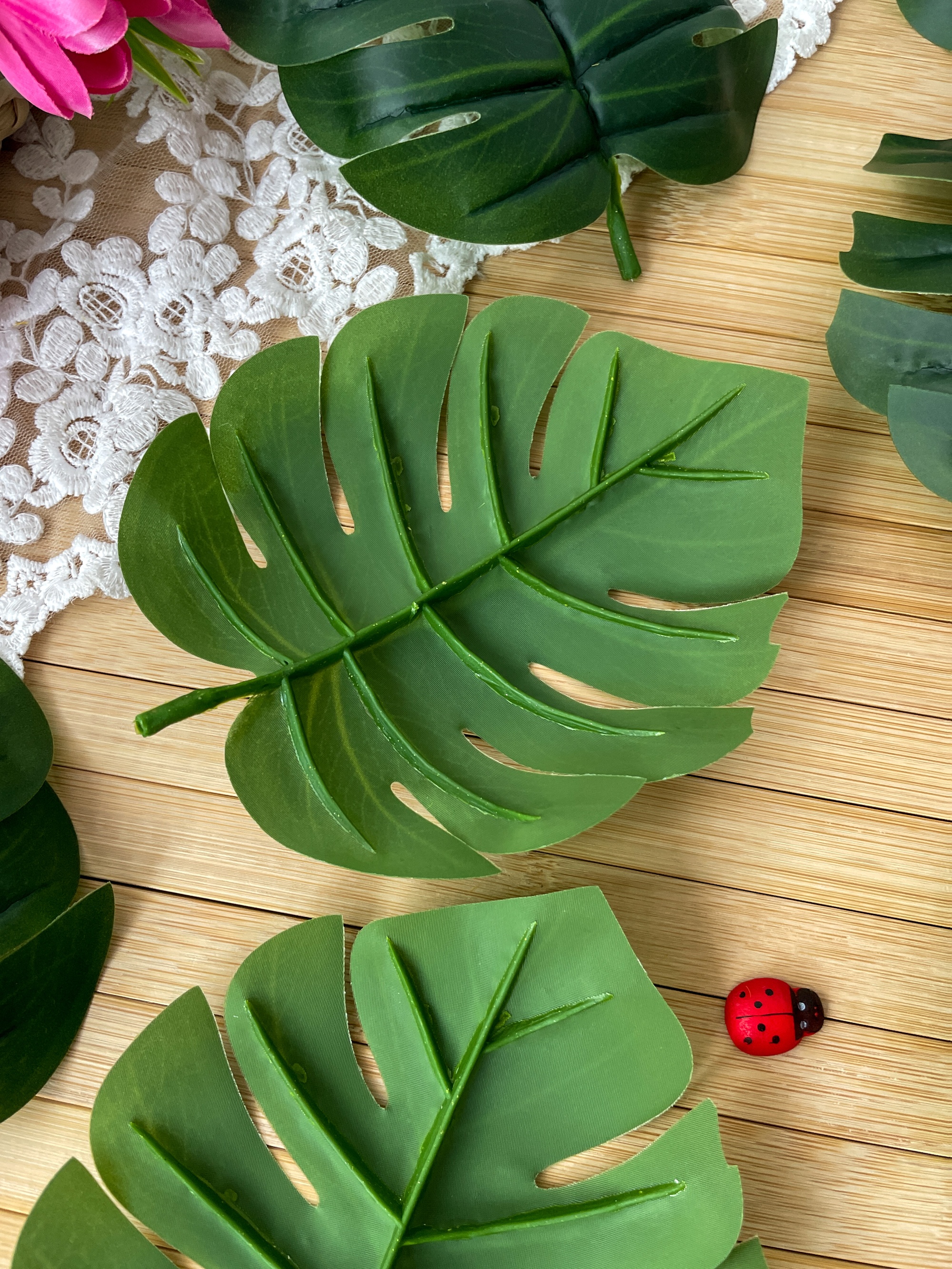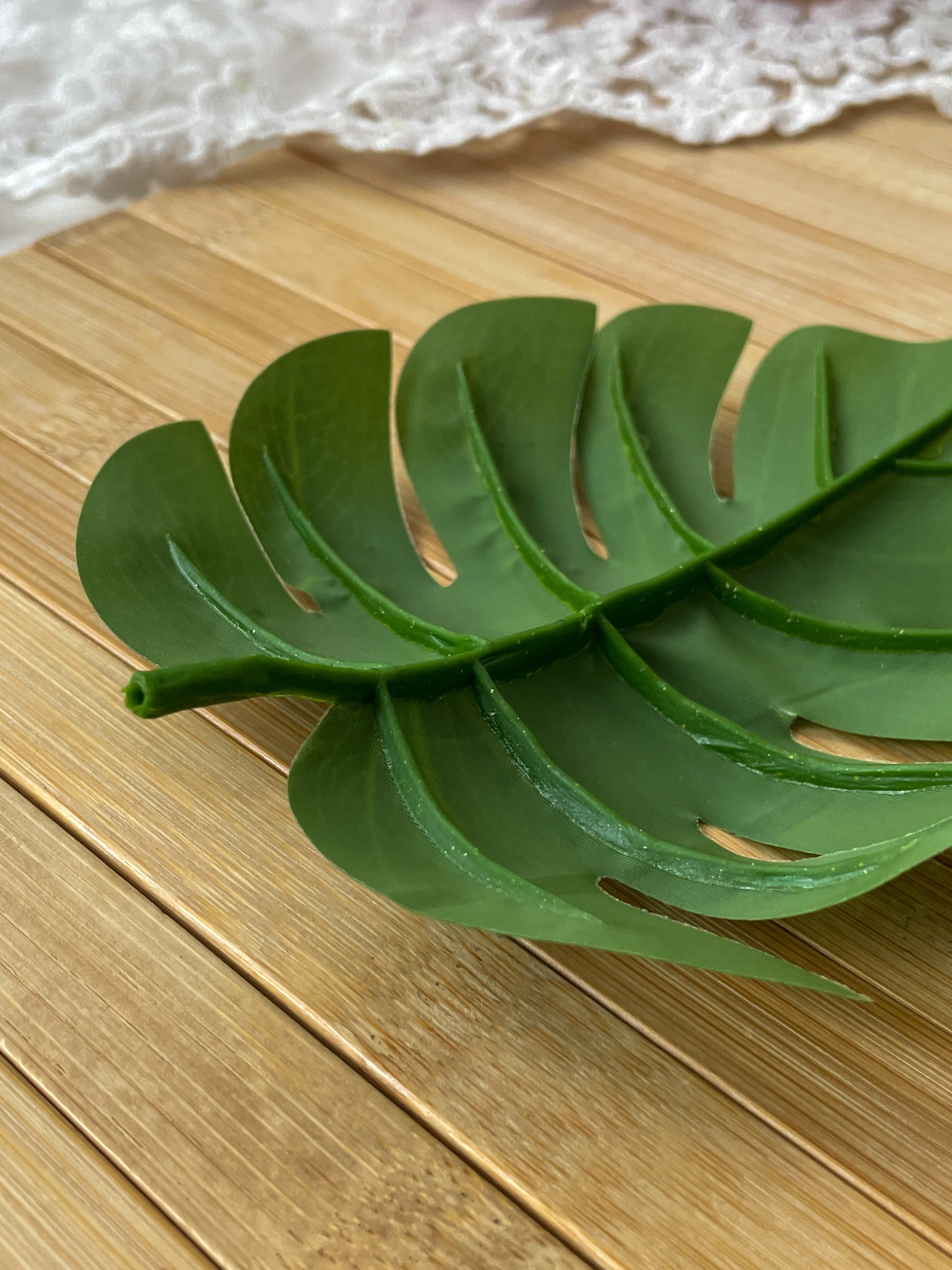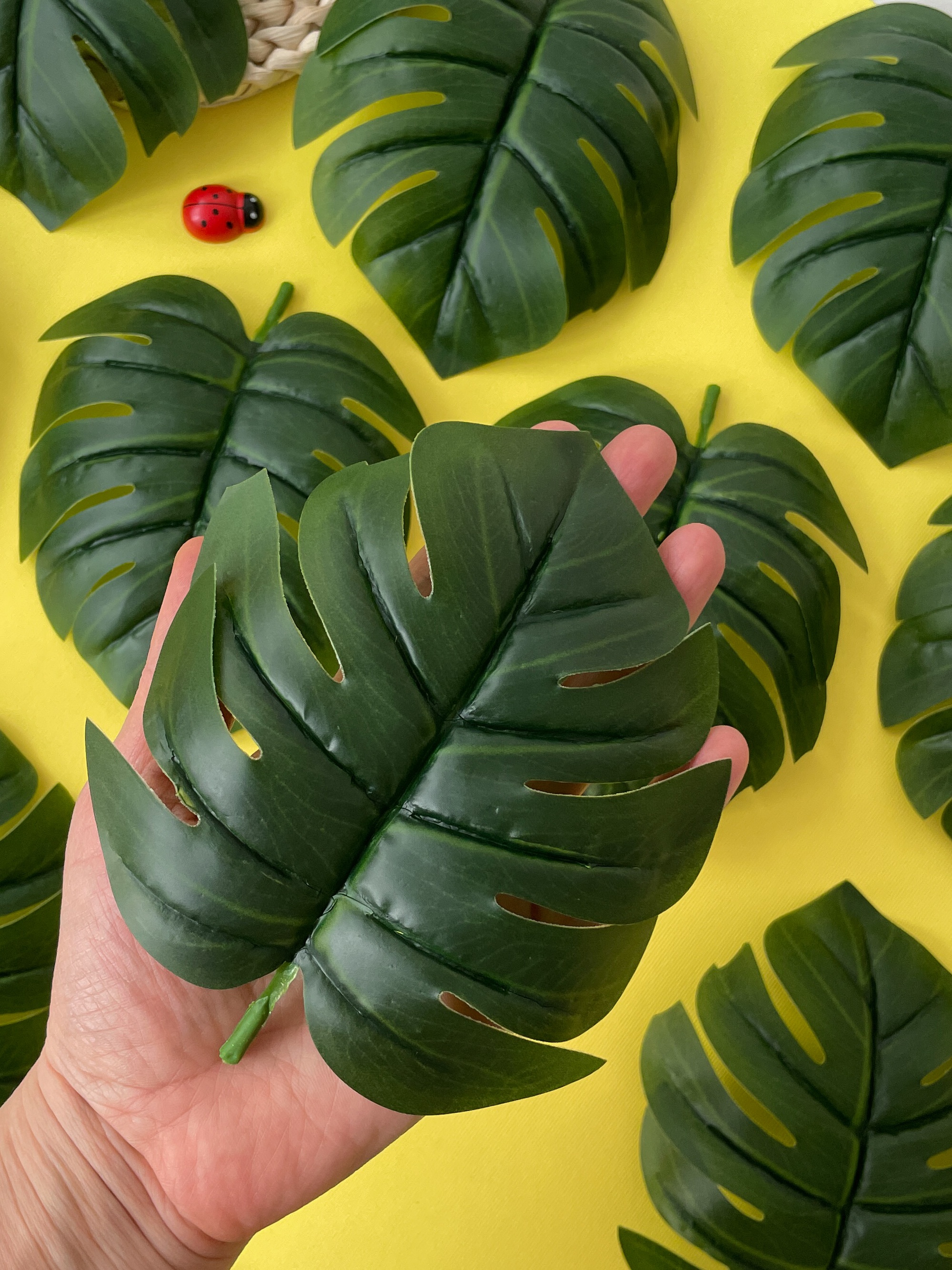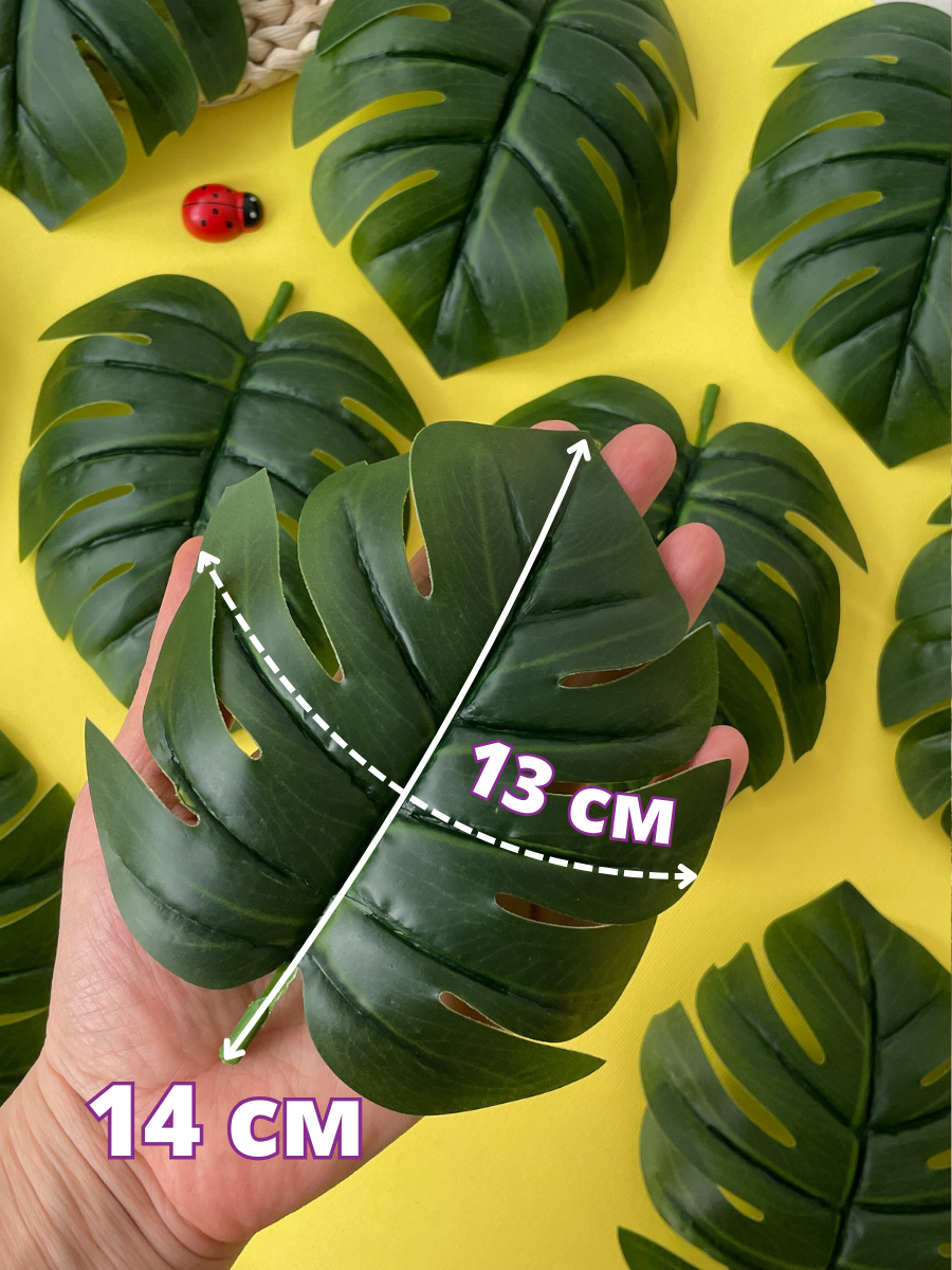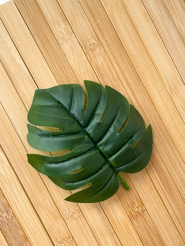 Искусственное растение представляет собой реалистичный крупный лист монстеры. Листья для декора выполнены из плотного материала. Искусственные растения, включая искусственную монстеру, могут использоваться в интерьерном дизайне для создания эффекта зелени и добавления природной атмосферы в помещение. Листья монстеры не нуждаются в поливе, освещении или удобрениях, что делает их удобными для тех, кто не имеет возможности или желания заботиться о живых растениях.