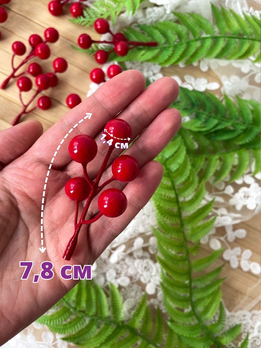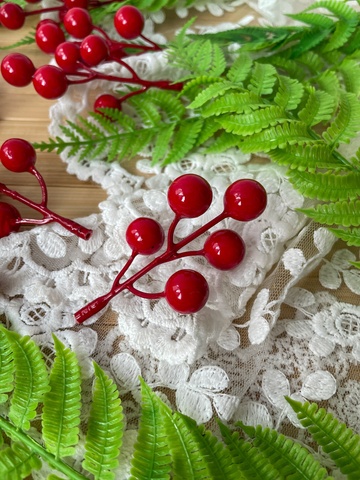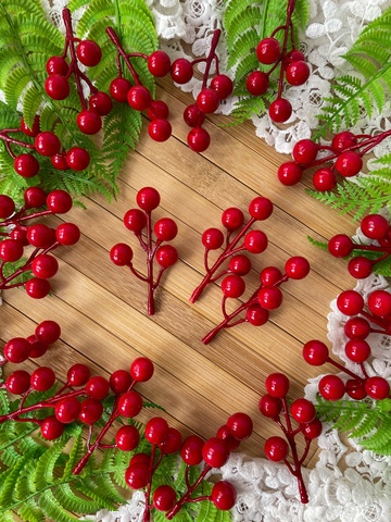 Ягоды красные искусственные, на ветке 5 -7 ягод 10-14 мм, набор 20 шт.